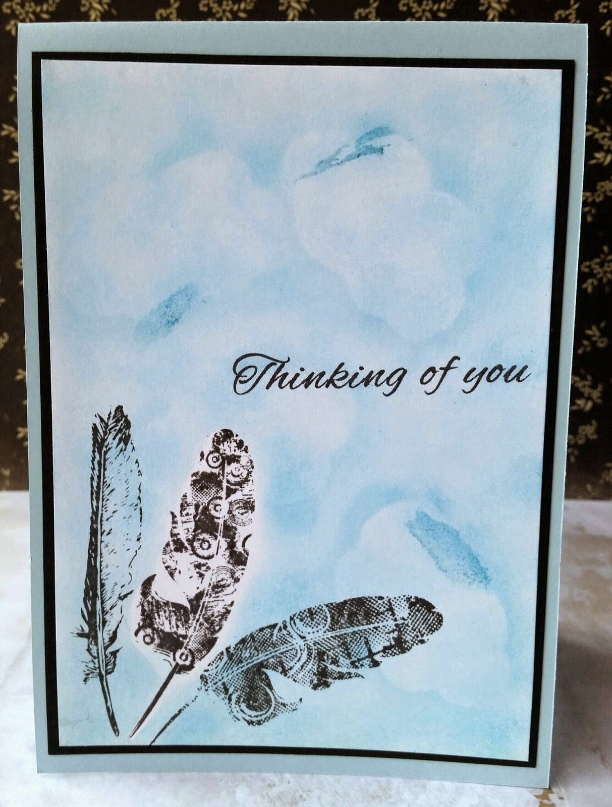 I used a light blue card stock as base, a white panel and sponged the sky and clouds. Then I stamped 3 different feathers onto the card, and the sentiment too.