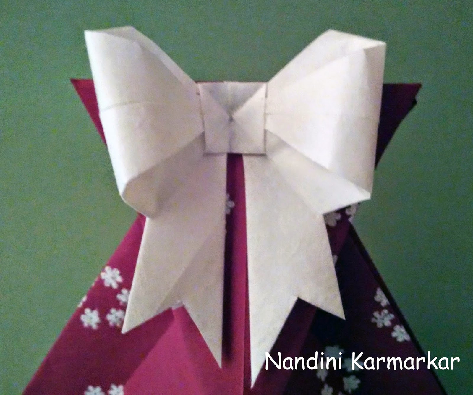 After I had folded the bag, I a large origami bow with a very thin, handmade paper. The tutorial for that is from Paper Kawai.